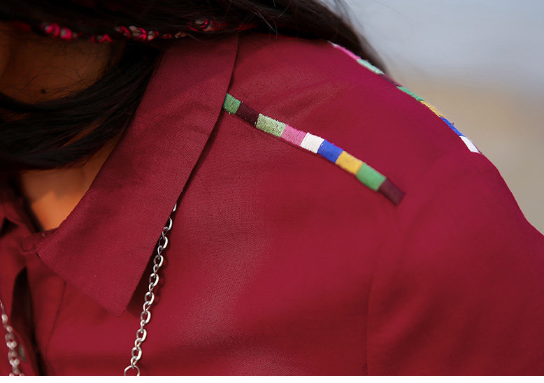 肩部不规则拼接,以刺绣点缀勾勒线条,造型感强,个性时尚,同时很好地修饰了肩部轮廓 不规则过肩拼接
