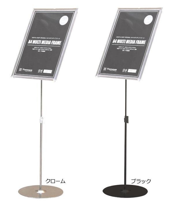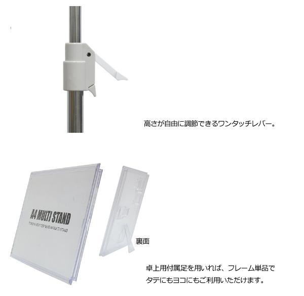 A4出力紙をそのまま掲示できるマルチメディアスタンドです。タテにもヨコにも使え、角度、高さもフリーに変えられるので、幅広い用途でお使いいただけます。フレームの取付・取外は簡単便利な差し込み式で工具不要。取り外してフレームのみでもご使用いただけます。ショールーム用スタンドとして最適です。 |