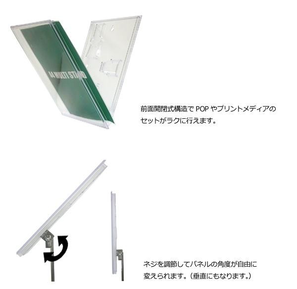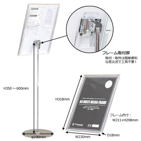| A4出力紙をそのまま掲示できるマルチメディアスタンドです。タテにもヨコにも使え、角度、高さもフリーに変えられるので、幅広い用途でお使いいただけます。フレームの取付・取外は簡単便利な差し込み式で工具不要。取り外してフレームのみでもご使用いただけます。ショールーム用スタンドとして最適です。 |