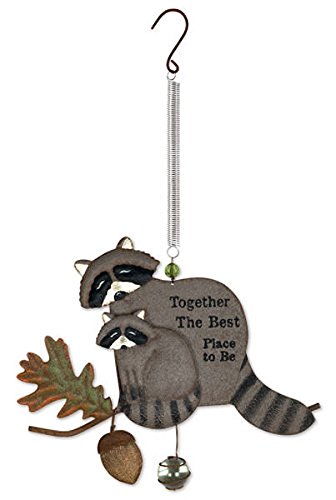 - Painted metal ornament includes parent and baby raccoon cuddling on a branch, accented by a marble hanging below; sign reads: Together The Best Place To Be