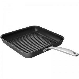 An everyday essential for searing foods with grill marks, this grill pan allows fats to drain away for healthier eating. The hard-anodized aluminum grill pan offers effortless food release thanks to a German-engineered, PFOA-free, 3-layer non-stick coating. The hard-anodized aluminum construction ensures superior heat conduction and even cooking. The rolled edges of the grill pan are designed for drip-free pouring, while angled side walls help liquids evaporate quickly and a rounded bottom facilitates efficient stirring. The stay-cool, contoured handle delivers a comfortable grip.Feature