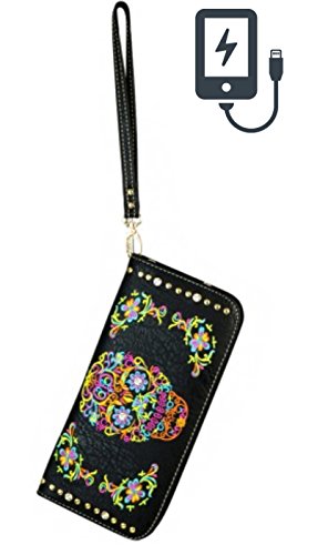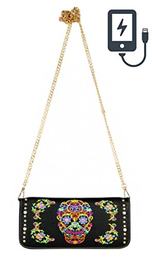 -. Brand : Montana West -. Department : womens -. Feature : Phone charging power source to charge all your devices. Cord included for powerbank. Battery life approx. 4-5 hours. Powerbank rechargable. / Sugar Skull Floral design with Silver and crystal studs. / A zipper enclosure for the entire wallet - Multi-card slots and 2 long slot compartments / Button Closure pocket at the back with powerbank. Detachable crossbody chain strap included. / 8.5" x 1.05" x 4.25" (Chain Strap 46") - PU Leather - Image colors for views other than front are for reference only. Phone is for reference is not included -. PackageQuantity : 1 -. ProductGroup : Shoes -. ProductTypeName : HANDBAG -. Title : Montana West Sugar Skull Phone Charging Convertible Clutch Wristlet, Crossbody