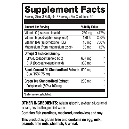 A high potency of 1,000 mg of EPA and DHA per serving extracted from cold water fish. Omega-3s not only support brain, heart, joint, skin and eye health but research shows it can help promote production of healthy tears in eyes as well.* - Gamma-linolenic Acid (GLA) from Black Currant Oil