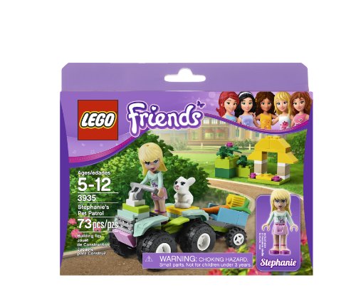 -. Binding : Toy -. Brand : L.E.G.O -. EAN : 0673419165785 -. Feature : Includes Stephanie mini-doll figure and bunny Daisy / Features bike trailer, outdoor scenery, bunny cage and carrot / Drive the bunny to the veterinarian, feed the bunny a carrot / L.E.G.O Friends pieces are fully compatible with all L.E.G.O System bricks / Collect all of the L.E.G.O Friends sets for a whole world of L.E.G.O Friends fun -. Genre : Other -. IsAdultProduct : 0 -. ItemPartNumber : 3935 -. Label : L.E.G.O -. Manufacturer : L.E.G.O -. Model : 4653150 -. MPN : 3935-4653150 -. PackageQuantity : 1 -. PartNumber : 3935-4653150 -. ProductGroup : Toy -. ProductTypeName : TOYS_AND_GAMES -. Publisher : L.E.G.O -. ReleaseDate : 2012-01-01 -. Studio : L.E.G.O -. Title : L.E.G.O Friends Stephanie's Pet Patrol 3935 -. UPC : 673419165785 -. Warranty : No Warranty
