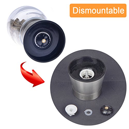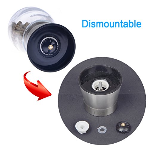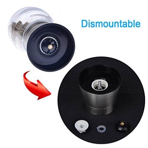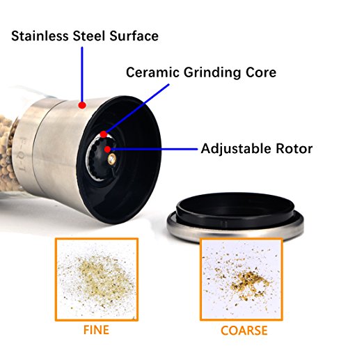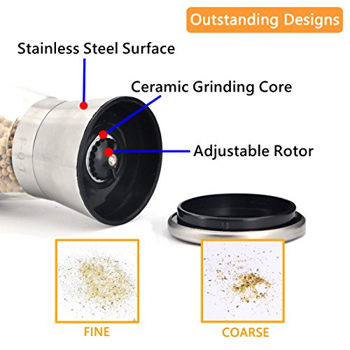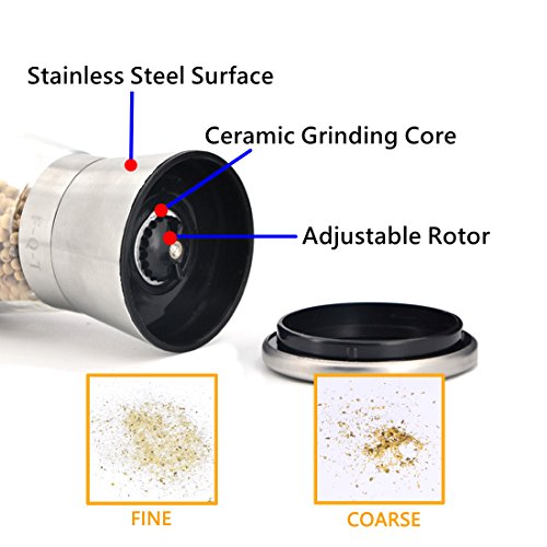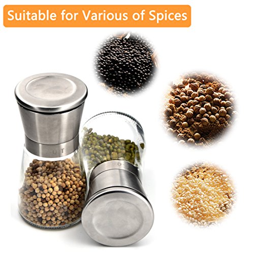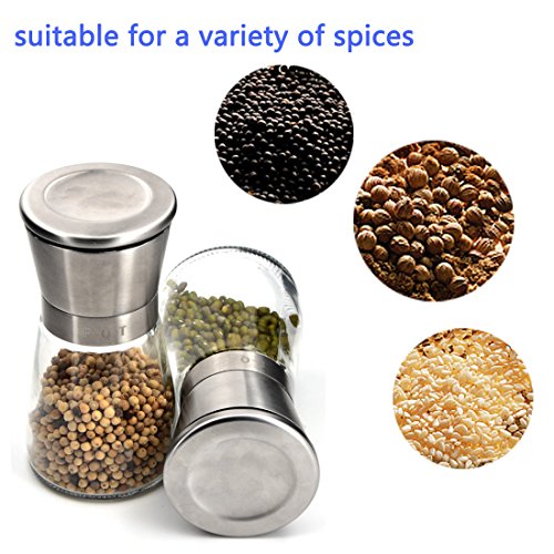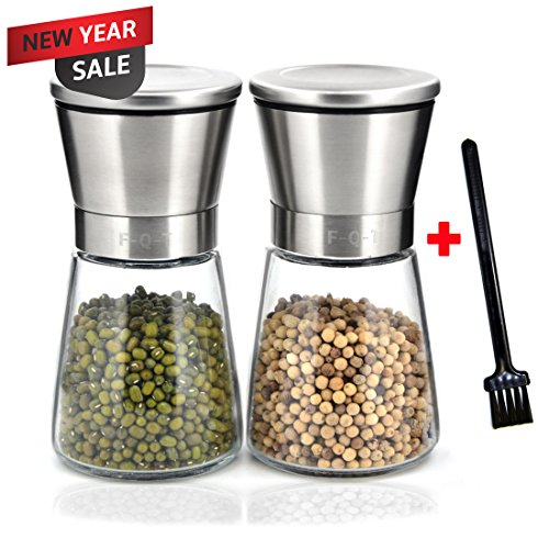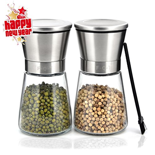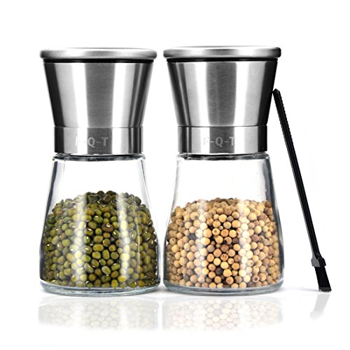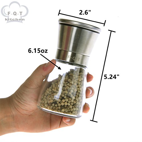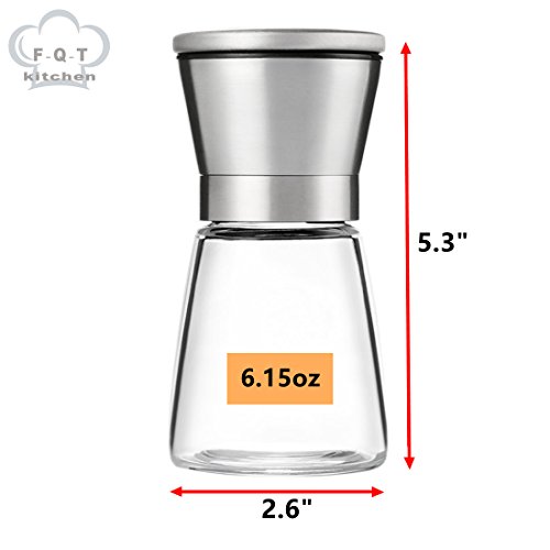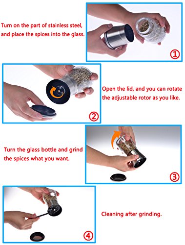 Studio : F-Q-T kitchen Publisher : F-Q-T kitchen Product Description Package includes: ?? - pepper mill ×2 ?? - Cleaning brush ×1 ?? - Product manual ×1 Material: ?? Top material: High-quality stainless steel ?? Body material: Thickening glass ?? Grinder machine: Ceramic Introduction of use: ?? 1. Turn on the stainless steel position, and put the spices into the glass bottle. And then cover the stainless steel position. ??2. Open the lid of the pepper mill. You can see the grinding adjustable rotor and the exit of spices. ?? 3. Rotate the grinding adjustable rotor and adjust the grinding thickness. ?? 4. Rotate the glass bottle lightly, you can see the spices fell out which like farinose. Tips: ?? You can wash the grinding machine in water after grinding the spices. And also clean stive with cleaning brush which is free bonus. Wish you made fresh spices and have a nice dinner! 0