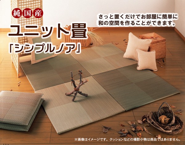 【商品名】 純国産 ユニット畳 『シンプルノア』 ブラウン 82×82×1.7cm(9枚1セット) 軽量タイプ 【ジャンル・特徴】 たたみジョイントマット ■サイズ・色違い・関連商品■4枚1セット ブルー■4枚1セット ブラウン■6枚1セット ブルー■6枚1セット ブラウン■9枚1セット ブルー■9枚1セット ブラウン[当ページ] 届いたユニット畳を床に置くだけで和のスペースが出来上がります。ヘリの無い、半畳タイプです。同系色の色で飽きのこない、落ち着いた市松柄を出しました。表生地には国産(九州産)のい草を使用しています。一本一本が太く、表皮が厚く、繊維がキメ細かいので弾力性があり、耐久性に優れています。い草には空気の自然浄化作用、湿度の調節作用などがあります。また汚れにくく、使用するうちに黄金色に変化し、味が出ます。軽量タイプなので、持ち運び、設置、片づけなども楽にできます。裏の不織布にはすべり止め加工を施しています。また、連結用のテープを使用すれば、お部屋に合わせて簡単に何枚でもつなげることが出来ます。■商品スペック【サイズ】82×82×1.7cm【素材】表地=い草(九州産) ※