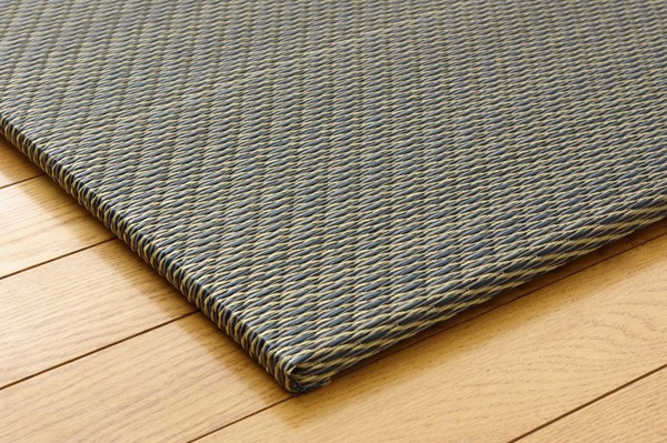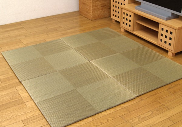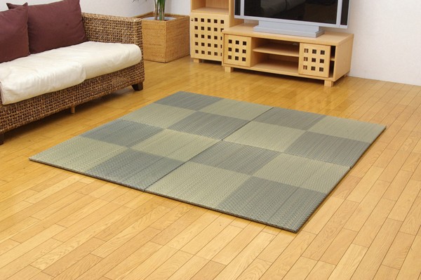届いたユニット畳を床に置くだけで和のスペースが出来上がります。ヘリの無い、半畳タイプです。同系色の色で飽きのこない、落ち着いた市松柄を出しました。表生地には国産(九州産)のい草を使用しています。一本一本が太く、表皮が厚く、繊維がキメ細かいので弾力性があり、耐久性に優れています。い草には空気の自然浄化作用、湿度の調節作用などがあります。また汚れにくく、使用するうちに黄金色に変化し、味が出ます。軽量タイプなので、持ち運び、設置、片づけなども楽にできます。裏の不織布にはすべり止め加工を施しています。また、連結用のテープを使用すれば、お部屋に合わせて簡単に何枚でもつなげることが出来ます。