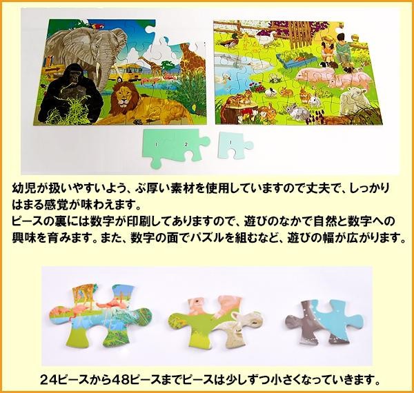 | 遊びながら学習につながる集中力と作業力を伸ばす、「スモールステップ」方式のジグソーパズルのセット。このSTEP3は、24ピースのパズルから48ピースのパズルまで、合計3枚のジグソーパズルがセットされています。少しずつピースを増やしていくことで、パズルを完成させる達成感を味わいながら、集中力と作業力を高めていけます。 |