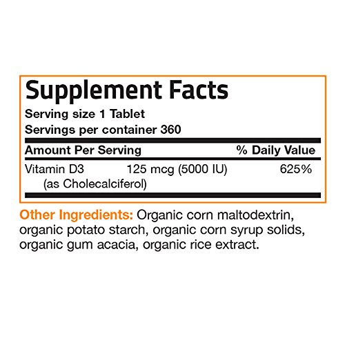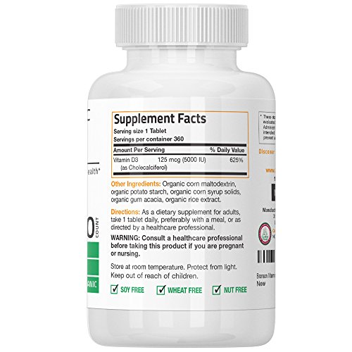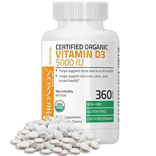 Bronson's USDA Certified Organic Vitamin D3 delivers 5000 I.U. in each tablet. And Bronson utilizes vitamin D3, the preferred form of this important nutrient. Research has demonstrated that Vitamin D supports bone, muscle, immune, colon, and breast health.*