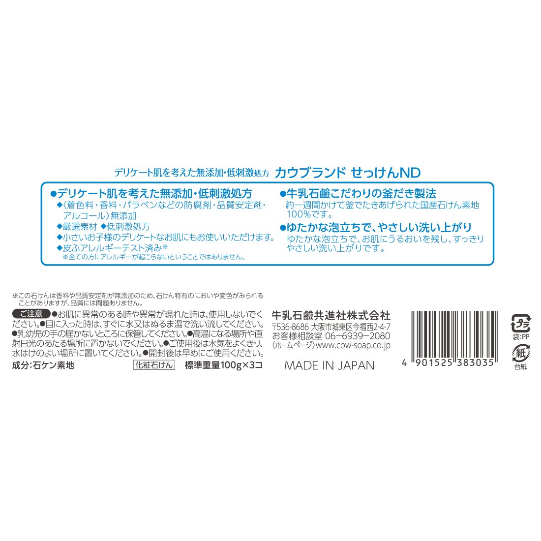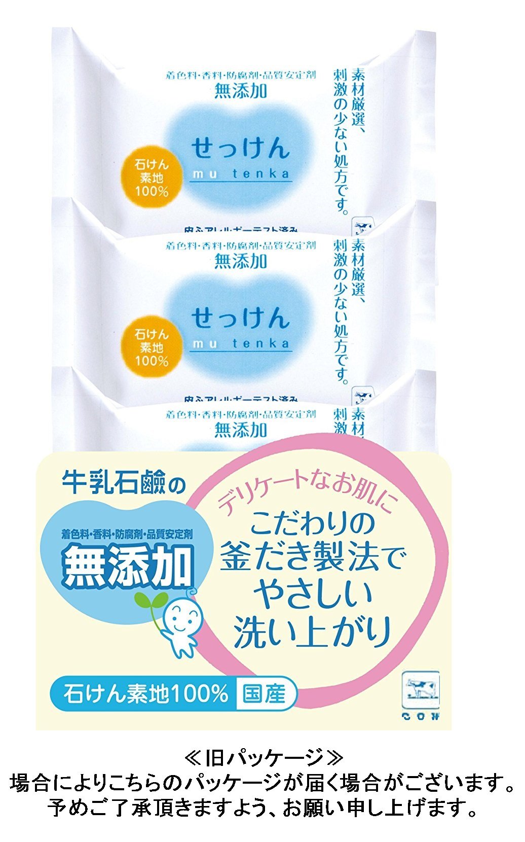 "Cow brand non-additive soap 3P" is a soap of "non-additive series" that sticks to tenderness, which does not use coloring / nonfragrance, further preservatives or quality stabilizers.