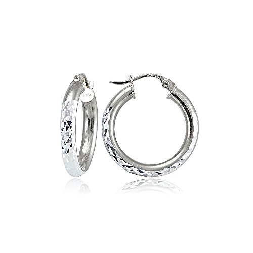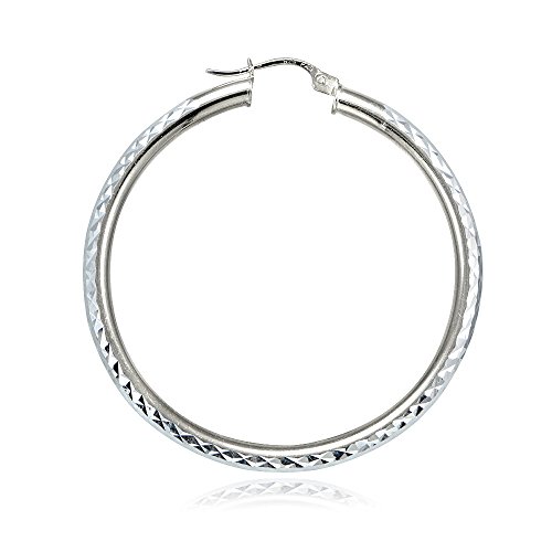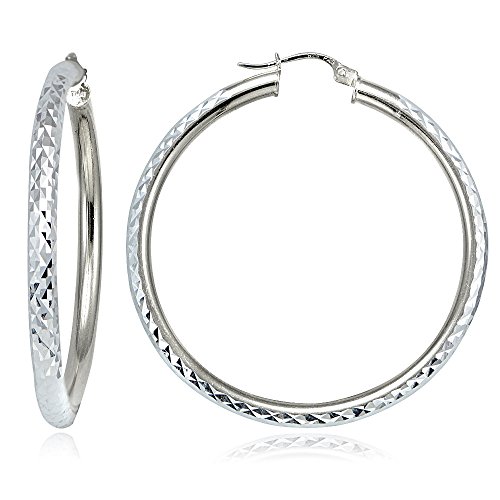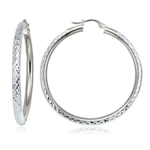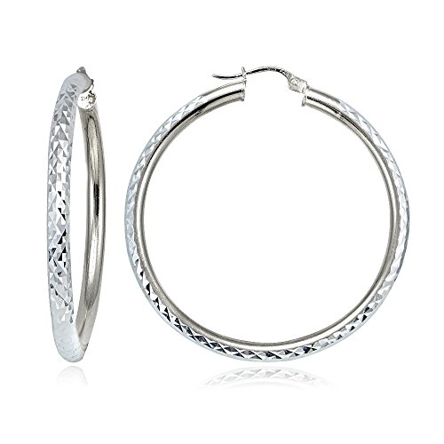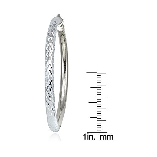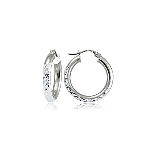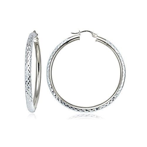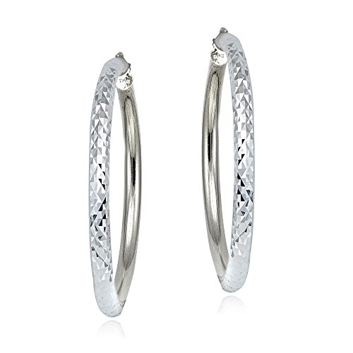 •These earrings feature sterling silver high polished diamond-cut round hoops.