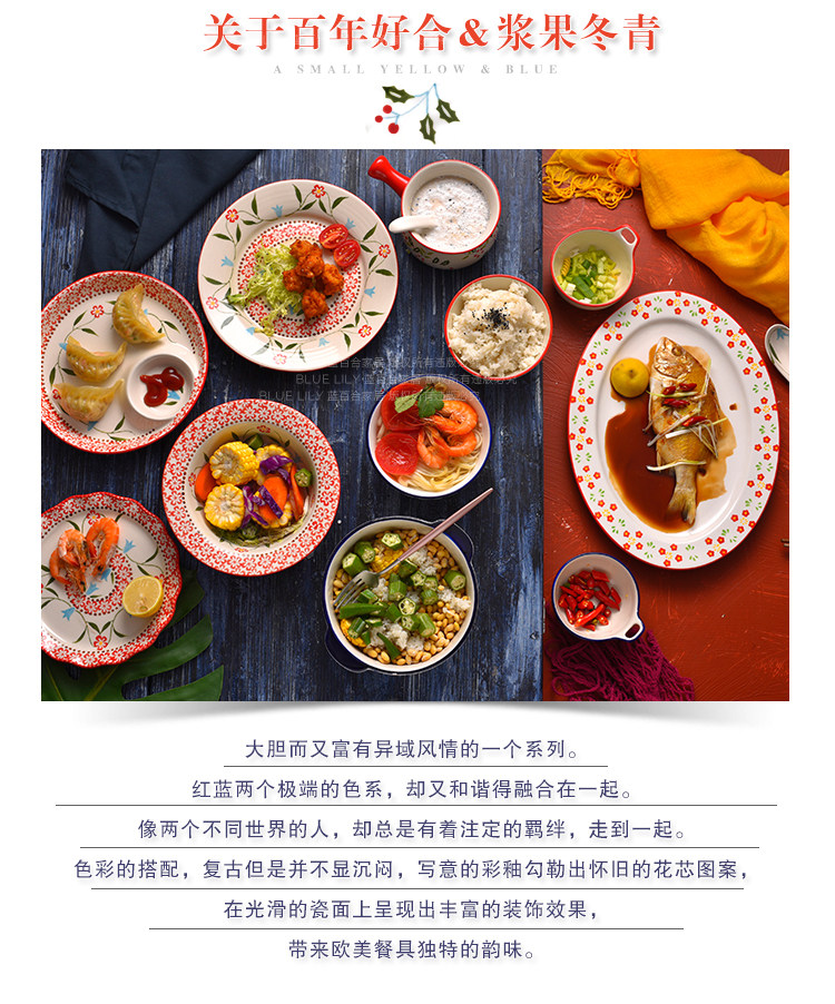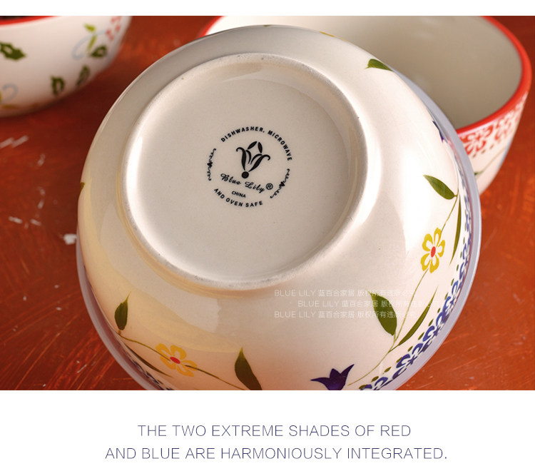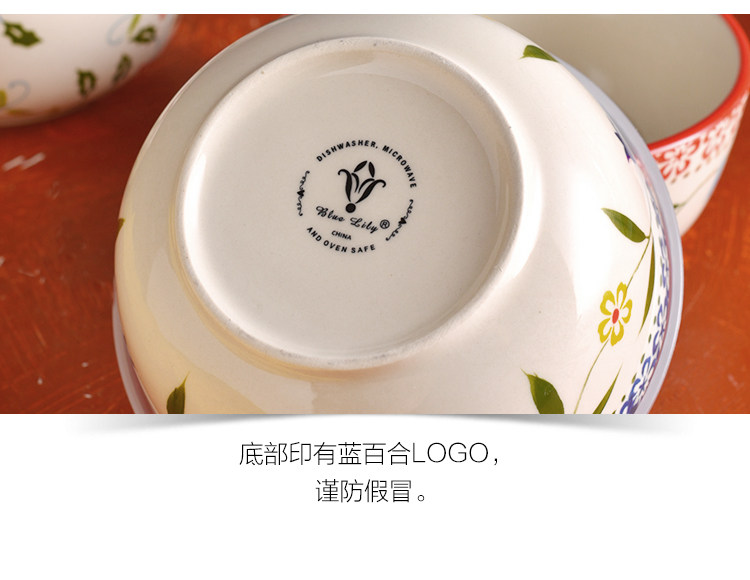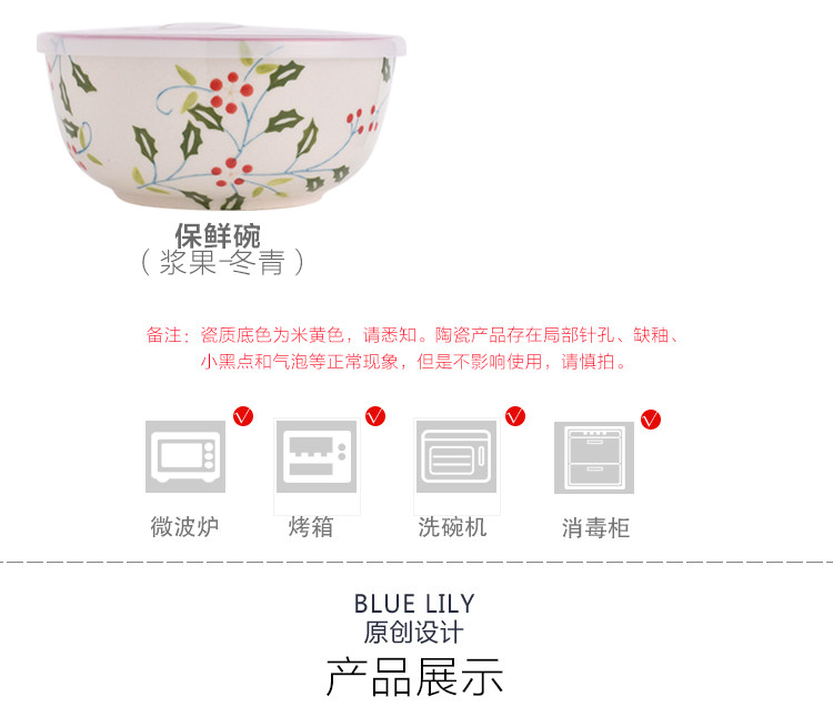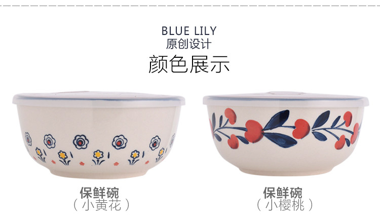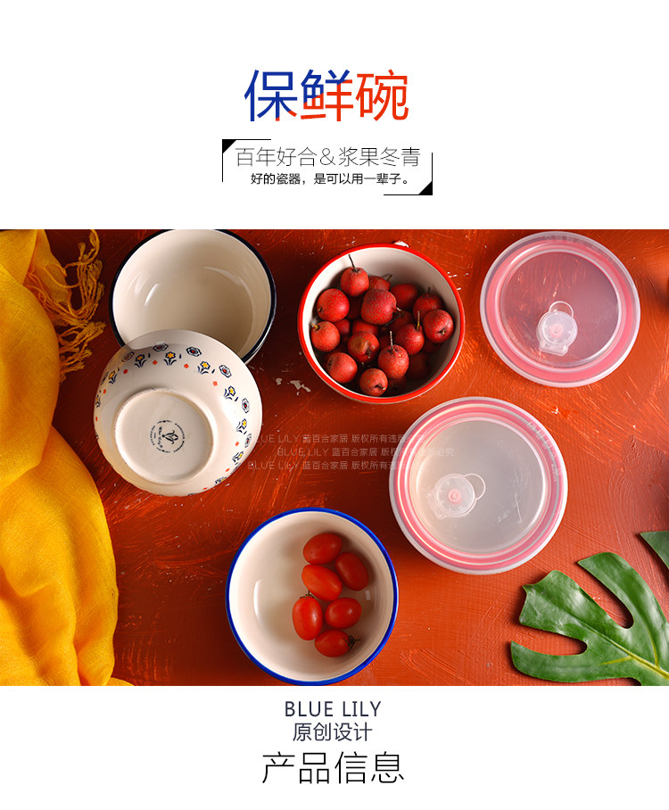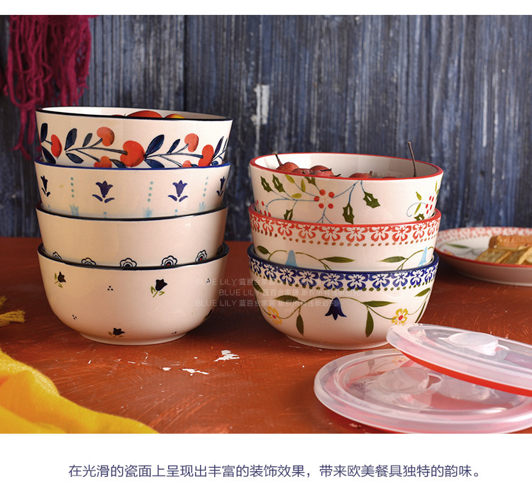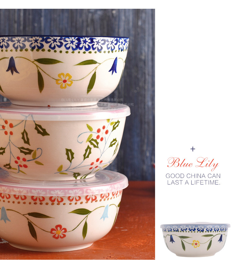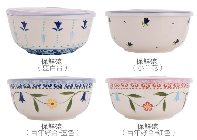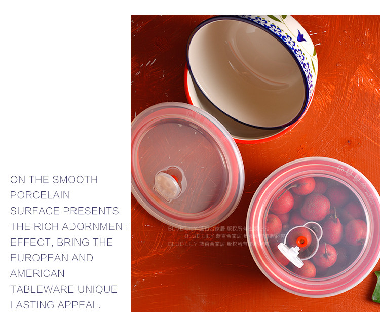 美式手绘釉下彩陶瓷保鲜碗沙拉碗带盖饭盒便当盒微波炉适用