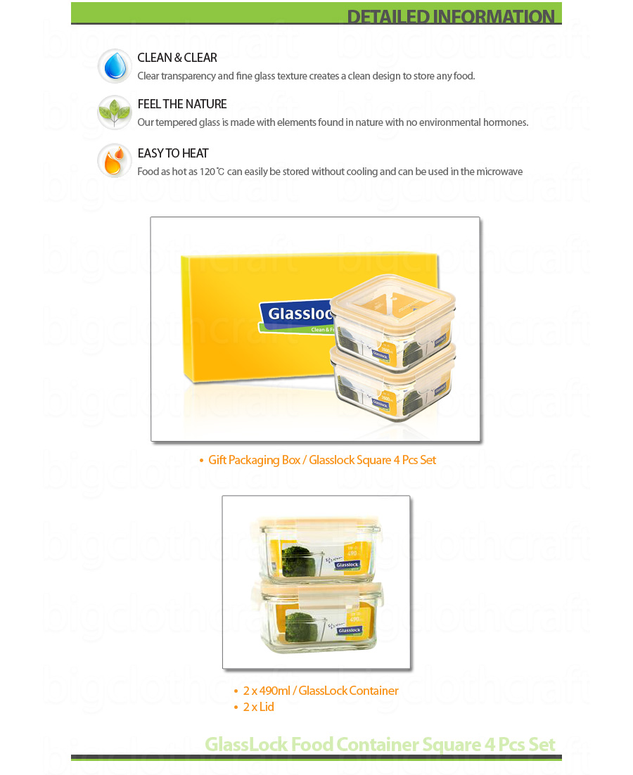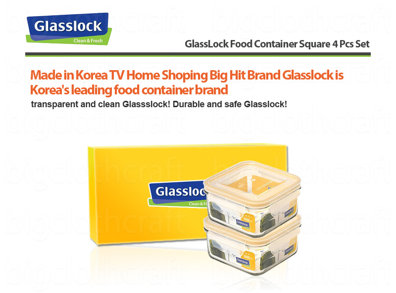 | 4Pcs Set GlassLock Safety Tempered Glass Taper Food Container ============================================== This is Genuine Glasslock Food Container! Made in Korea. Glasslock is Korea's leading food container brand. #Feature - Clean & Clear Clear transparency and fine glass texture creats a clean design to store any food - Feel The Nature Our tempered glass is made with elements found in nature with no environmental hormones - Easy To Heat Food as hot as 120℃ can easily be stored without cooling and can be used in the microwave. #Retail box includes 2 x 490ml GlassLock Food Container 2 x Lid |