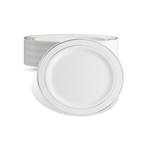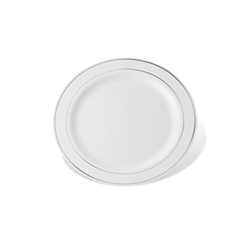 -DINE IN DELUXE!!! - High Gloss Shine...Stark Snow White ...Lustrous silver border....Rich Distinctive Look...all these characterize our DELUXE round plate collection created for sophistication and grace. Dress your table to perfection. Awe your guests with these silver rimmed dessert plates, yet quit the hassle of washing dishes. Go green, go disposable so you're not left with a huge cleanup once your guests have left. Or, rewash and store for your next special occasion. --BENEFITS AND FEATURES-- ★Classical round shape design with silver rimmed border to set your table to perfection ★Wow your guests and yourself alike ★Heavyweight premium quality plastic to ensure no sagging, tearing or breaking ★Perfect choice for weddings, receptions, banquets, reunions, holidays, or family get-togethers ★Great for outdoor entertaining too ★Just toss these disposable dishes and be on your way!!! ★Fun and Frugal?? Wash and reuse for your next event ★Pack of 40 DELUXE heavyweight round white 6 inch dessert plates with silver rim Isn't life better when we get together more often? Whether a backyard barbecue or an extended family reunion, we believe in the value of spending time with friends and family. Busy lives and long to-do lists often get in the way, but when we simplify events with beautiful disposables, we do get the time to get together. There's no better feeling. So what are you waiting for? Change The Look Of Your Table, WOW Your Guests With These White Gold Border Dinner Plates, And Set The Bar At An All-Time High. Type PRESTEE in the AMAZON SEARCH BOX to view our complete line of china-like dishes, plates, cutlery, party tumblers, and mini plates for your upscale celebration.TRUST US, You'll be GLAD you did!! #1Unique Round Place Setting CLICK ADD TO CART NOW!!! 0
