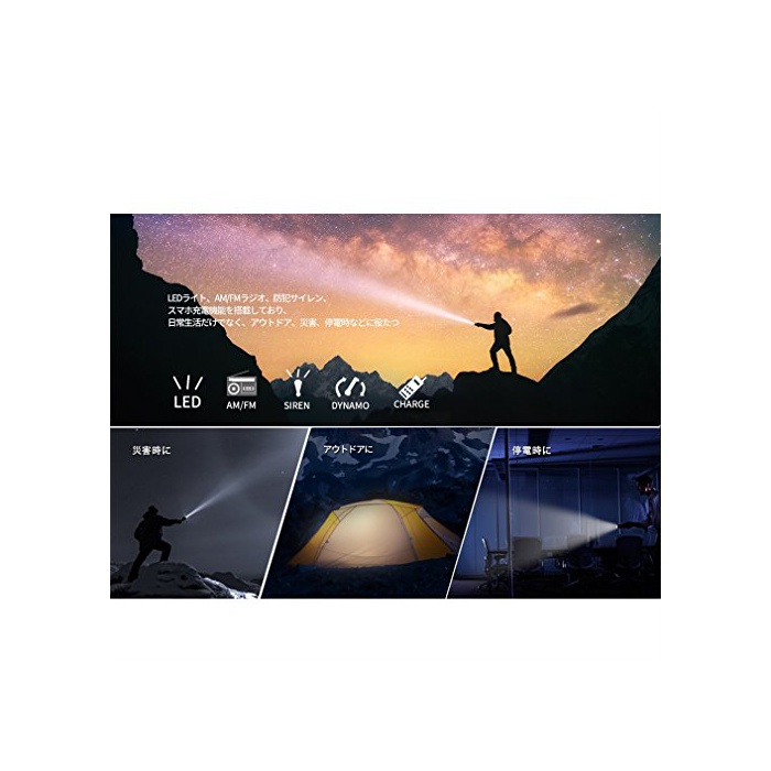 【다기능 탑재 라디오 라이트】 LED라이트,AM/FM라디오,방범 싸이렌,《스마호》충전 기능을 탑재하고 있고, 일상생활뿐만 아니라,캠프나 정전 등의 긴급시에 수동식에 충전할 수 있어 라디오를 들을 수 있는 회중전등입니다.