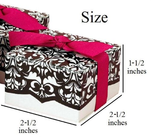 - Feature : *Sale for a limited time only!* / Semi-gloss Finish Damask Print Design Wedding Gift Boxes / 2.5 x 2.5 Inches Box Size, 1.5 Inches High. Ships unfolded. / Perfect for Truffles, Sweet Treats, Chocolates, Petit Mints, Nuts, Small Pictures, Ornaments, Favors, or Other Small Gifts / Free shipping! *Ribbon not included--many colors are available elsewhere on Amazon.