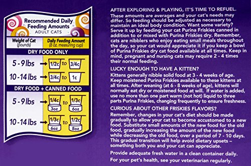 Directions:After Exploring & Playing, It's Time to Refuel. These amounts are averages and your cat's needs may differ. So feeding should be adjusted as necessary to maintain an ideal body condition. Want some variety? Serve it up by feeding your cat Purina Friskies canned in addition to or mixed with Purina Friskies dry. Remember, cats are nibblers who enjoy eating small meals throughout the day, so your cat would appreciate it if you keep a bowl of Purina Friskies dry cat food available at all times. Keep in mind, pregnant and nursing cats may require 2-4 times their normal feeding. Lucky to Have a Kitten? Kittens generally nibble solid food at 3-4 weeks of age. Keep moistened Purina Friskies available to these kittens at all times. After weaning (at 6-8 weeks of age), kittens will normally eat dry or moistened food at will. If water is added, use no more than one part warm (not hot) liquid to three parts Purina Friskies, changing frequently to ensure freshness. Curious About Other Friskies Flavors? Remember, changes in your cat's diet should be made gradually to allow your cat to become accustomed to a new food. Substitute small amounts of the new food for the old food, gradually increasing the amount of the new food while decreasing the old food, over a period of 7-10 days. This gradual transition will help avoid dietary upsets--something both you and your cat can appreciate. Provide adequate fresh water in a clean container daily. For your pet's health, see your veterinarian regularly. Store in a cool, dry place.