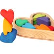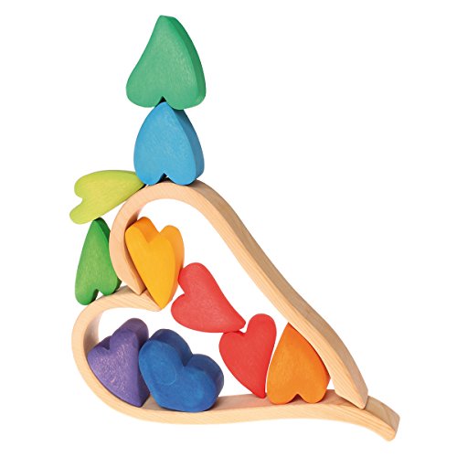 Share your love with someone special with this delightful, beautifully-made set of heart-shaped blocks from renowned wooden toymaker Grimm's Spiel und Holz of Germany. Set includes heart blocks in a rainbow of colors, set within a 3-piece wooden heart frame. The hearts come in a variety of sizes and shapes, are made from solid linden wood, then individually colored with certified nontoxic, child-safe water based stains (in accordance with stringent European standards). The frame/storage tray comes apart into 3 pieces, which can be used for additional design and building options.