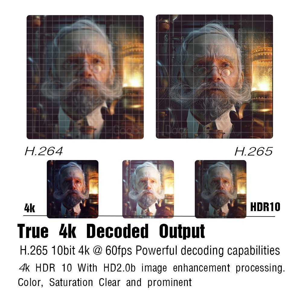 Support Decoder format: HD MPEG1/2/4,H.265,4K-HD,HD AVC/VC-1,RM/RMVB,Xvid/DivX3/4/5/6,RealVideo8/9/10