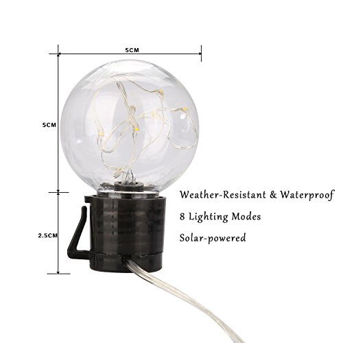 - High Efficiency Solar Powered: No battery or electricity required, charge by the sunlight, can work up to 10 hours or more when fully charged. The outdoor string lights will automatically turn on when it's dark and turn off during the day. 8 modes from steady color to various flashing. Waterproof for Indoor and Outdoor, withstanding bad weather like heavy rain, snow etc.