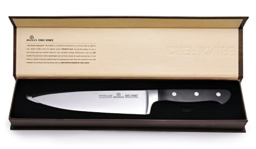 -. Feature : MORDEN TECHNOLOGY: Benchusch Balanced 8" Chef Knife is thoroughly researched and developed based on ICE HARDENED treatment - a special additional heat treatment by Germany technology focused on steel hardening processes. This makes the knife more durable and the anti-corruption ability better than other common knives. / PRO-QUALITY BLADE: Crafted with professional German stainless steel, our Benchusch premium chef knife has a superior sharp blade, which is rust resistant and sturdy for fine cutting precision for excellent cooking experiences. Moreover, expert craftsman bevels this premium blade carefully on both sides - adding to the quality control while increasing cutting efficiency and also retaining its sharpness for many years without the need of re-sharpening. / ERGONOMIC HANDLE: The amorphous thermoplastic terpolymer (ABS) handle with traditional style-3 rivet and full tang will fit comfortably in your hand and provides resistance and toughness that are excellent qualities for knife handles. In addition, the stainless steel bolster provides smooth transitions from knife blade to the handle. The perfect design helps to strengthen the knife, offering durability and counter balance. / ELEGANT GIFT BOX: Our knife comes with premium packaging which grants as an ideal gift for housewarming, anniversaries, wedding...or even for yourself. You can also conveniently store your knife into this gift box after cleaning and drying. / 100% SATISFACTION GUARANTEE: Our product comes with 100% money back guarantee to ensure you get what you deserve; therefore, if for any reason you are not satisfied with the purchase of the Benchusch 8" Chef Knife at any time, we will refund your money without questions asked.