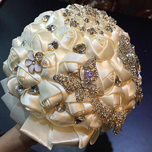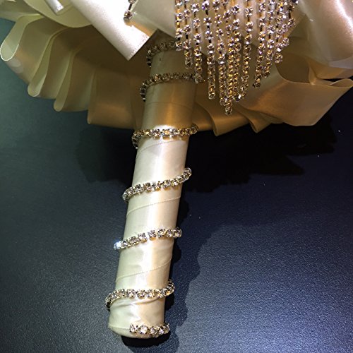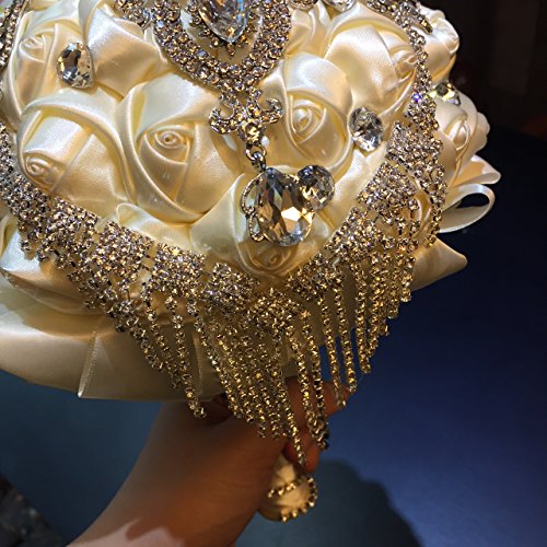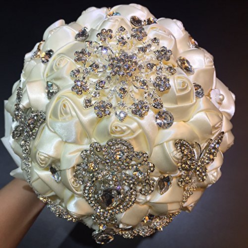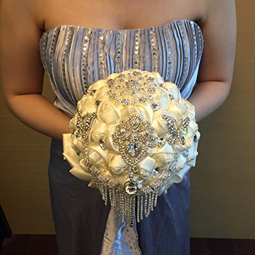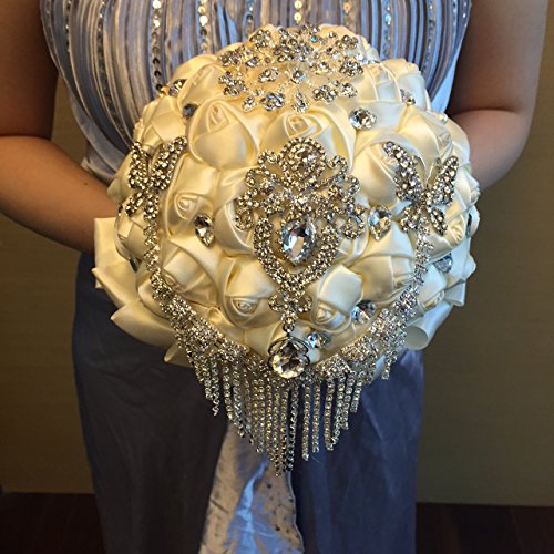 - Feature : about 7 X 12 inches / Materials: satin ribbons, lace, decorative brooches/ pearls, foam top inner base, PVC holder / Designed by M.Ching (Society6.com Artist) / This bouquet has a base of about 3 dozen satin roses. The top is garnished with brooches, pearl and crystal sprays. / PLEASE NOTE: The bouquet you will get is generally the same as on the pictures. Sometimes the designer, M.Ching, would use a similar brooch if a particular brooch is out of stock. She guarantees the general feel of the bouquet would be definitely the same as described. Rest assured most of the brooches are the same but, sometimes, if a particular brooch is out of stock, she will replace it with a similar one. We want to see a happy bride and a happy customer so we make a note here. We wish you a happy wedding day!