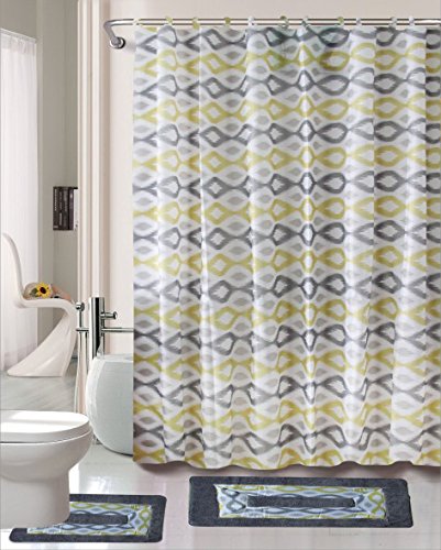 -. Feature : 15 piece set includes: 1 shower curtain (70x70); 1 Contour rug (18x18); 1 rectangle rug (18x30); 12 shower hooks (standard size) / Material: polyester / Machine wash