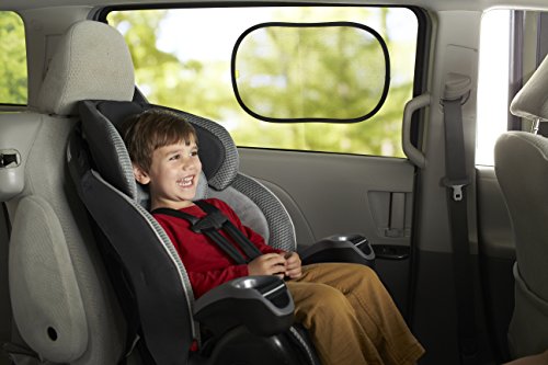 -. Feature : Protects from UV rays and sun glare without blocking child's view, maintaining driver visibility / Keeps your child cool / Made of a dual layer lightweight mesh/PVC material that securely clings to your window with no adhesive required / Pop Open soft twist frame is flexible and durable, allowing the shades to easily fold for storage / Includes two large (20 x 13.75 inch) shades for maximum coverage