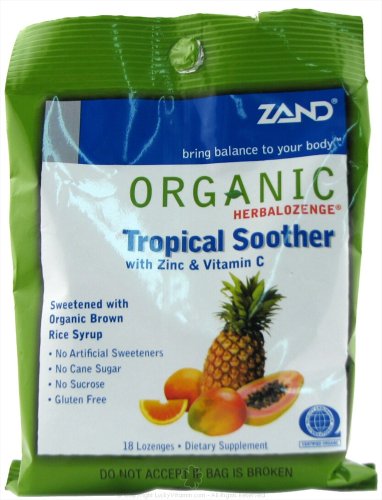 Studio : Zand Publisher : Zand Binding : Health and Beauty Product Description Zand Organic HerbaLozenges Tropical Soother -- 18 LozengesDescriptionWith Zinc And Vitamin C --Sweetened with organic brown rice syrup. --No artificial sweeteners --No cane sugar --No sucrose --Gluten free ZAND Organic Herbal Lozenges are made with Certified Organic Brown Rice Syrup, making these lozenges free from simple or refined sugars. Certified Organic Brown Rice Syrup is all-natural, tastes wonderfully sweet, and allows health conscious consumers to utilize ZAND Herbal Lozenges year round without concern over restricted diets, refined sugars, or the use of artificial sweeteners.