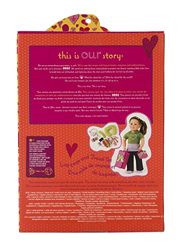 For girls on the go, this chic and stylish travel set is a must. It has everything a girl needs for a business trip, international flight, or weekend getaway. With 17 different and independent pieces, this set provides as much fun and entertainment as your imagination can handle. All Our Generation dolls, clothes, and accessories are made with safe, carefully-chosen, high-quality material. They can be collected and saved and recycled the old fashioned way (by being passed on), are shipped in environment friendly packaging, and are easy to clean and maintain. At Our Generation we’re dedicated to a new, multifaceted generation of girls who are playing hockey, getting involved in charities, dressing fashion-forward, and still finding time to, you know, be kids! Our Generation is much bigger than an 18” doll. It's about girls growing up together and creating the narrative of an extraordinary generation, and each and every one of our products reflects our progressive mission. Every time an Our Generation doll or accessory is purchased we donate 10 cents to the Free The Children's Power of a Girl Initiative, which is dedicated to addressing the unique challenges young girls face in accessing education, staying healthy, and overcoming poverty in developing countries. This travel set is fully compatible with most 18” dolls, including American Girl dolls and accessories. It includes 1 large suitcase, 1 large and 1 small carry-on case, 1 passport, 1 ticket booklet, 1 boarding ticket, 1 digital music player with headphones, 1 digital camera, 1 nail brush, 1 pair of nail clippers, 1 jar of cuticle cream and 1 tool, 1 comb, 1 toothbrush, 1 toothpaste, 1 neck pillow and 1 sleeping mask (please note: doll not included). From a good cause, for a good cause. Join the Generation.Feature