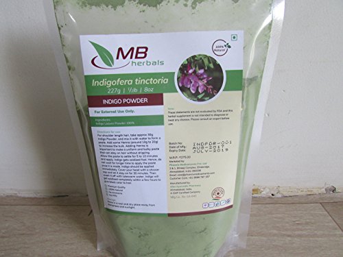 Studio : MB Herbals Publisher : MB Herbals Binding : Health and Beauty Product Description MB Herbals Pure Indigo Leaf Powder 227g / 1/2 lb / 8 oz / 0.5 L 100% Pure - Indigofera tinctoria Leaf Powder For External Use Only. 2017 Crop. Manufacturing Date: August 2017 Expiration Date: July 2019 MB Herbals Indigo Powder is safe because it is free from all kinds of chemicals such as PPD, Ammonia, Parabens etc. Absolutely free from any kind of preservatives. 100% Natural Indigo Powder. Does not cause irritation to eyes and the sensitive skin of scalp. FOR EXTERNAL USE ONLY: Directions for use: For shoulder lenght hair, take approximately 30g Indigo Powder and mix it with water to form a paste. Add some pure Henna Powder (approx. 20g) to increase its bulk so that it doesn't drip after applying on the hair. Allow the paste of Indigo and Henna to settle for 5 to 10 minutes. Do not keep more than 10 minutes because Indigo gets oxidized fast. Apply the paste. Cover head with a shower cap and let the paste stay on hair for about 30 minutes. Wash it off with lukewarm water. After a few hours, indigo will get oxidized completely and give a natural black color to hair. Storage: Store in a cool and dry place, away from dampness and sunlight. SATISFACTION GUARANTEE: We are passionate about our products and put the highest emphasis on quality. We are confident that you will love our products. For any reason, if you are not happy with the purchase, just send us a message and we will refund your full payment without any conditions or returns. 0