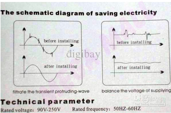 With the combination of latest advanced electric power saving technology of Germany and Taiwan, Electricity Saving box can stabilize the working voltage,balance the current source, so that to save the power consumption and prolong the lifespan of electrical appliances for the end users effectively,It can be used for almost all common appliances such as air condition-ing,washing machine,icebox, electronic fan,Tv Sets, pump, audio-video,and fluorescent lamp,etc,it's applicable for house,office, firms,shops and mini-sized factories.