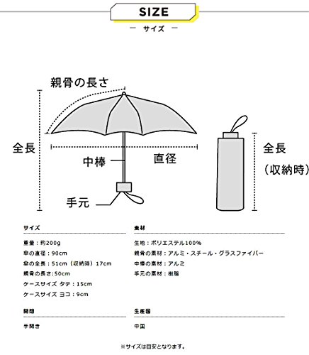 -. Feature : 本体サイズ:(全長)約51cm、(傘の直径)約90cm、(親骨の長さ)約50cm、(収納時全長)約17cm、(ケースサイズ)約15×9cm / 本体重量:約200g / 素材・材質:(本体)ポリエステル100%、(親骨)アルミ・スチール・グラスファイバー、(中棒)アルミ、(手元)樹脂 / 原産国:中国 / 開閉:手開き / 紫外線遮蔽率:(濃色)約90%、(淡色)約80%