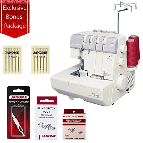 -. Feature : 2, 3, or 4 thread overlock / Lay-in thread tension dial / Handy needle threader | Easy rolled hem change-over / Convenient thread cutter / Bonus Package Includes: Janome Blind Stitch Foot, Janome Gathering Attachment, Janome Needle Threader, Organ 90/14 Universal Needles (10pk), Organ 75/11 Universal Needles (10pk) *Items may be substituted and are subject to stock on hand. Packaging might vary. *Items may be substituted and are subject to stock on hand