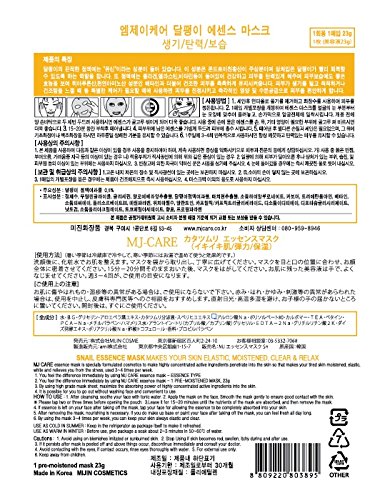 - Feature : MJ CARE essence mask is specially formulated cosmetics to make highly concentrated active ingredients penetrate into the skin so that makes your tired skin moistened, elastic, white and relieves you from the stress, used 3~4 times per week. / You feel the difference immediately by using MJ CARE essence mask- ESSENCE TYPE / By using high grade mask sheet, maximize the absorbing power of highly concentrated active ingredients into the skin / It is possible for you to go out without washing face and convenient to use. Power relaxation sin with moisturizing treatment. For professional spa results- at home / Snail:Alive, Elastic, Moisturizing