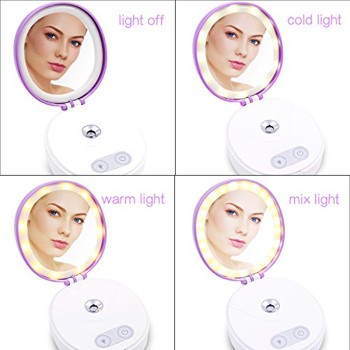 - ❤️LED MIRROR———with 3 different levels of lights, press 1 time is turning on the warm light, press 2 times is white light, press 3 times is mixed light, and press 4 times is turning off the LED lights. which can meet all of your light requirements as like lack of light for makeup or use it as the light replenishment for taking photo, it can also reduce the harm to eyes. Also usable for body and hair.