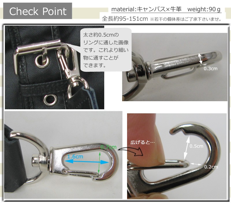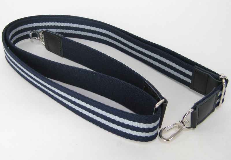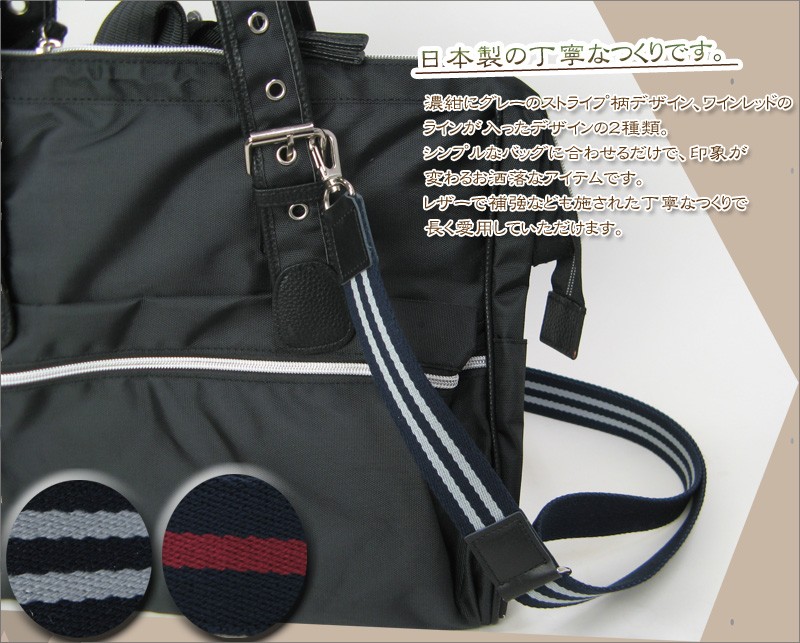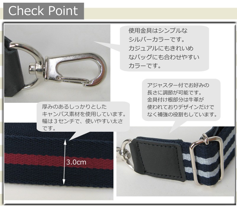 キャンバス地と牛革を組み合わせたショルダーストラップです。 日本製の丁寧な作りです。 幅は3cmあり、どんな鞄にも合わせやすいサイズです。 長さはアジャスターでお好みで調節可能(95~151cm)。 濃紺にラインが入ったお洒落なデザインで、シンプルなバッグに 合わせて印象を変えてみるのに役立ちます。 具はシンプルなシルバーカラー。カジュアルになりすぎない上品なデザインです。 お手持ちのバッグの付け替えやハンドメイドのパーツとしておすすめです。 注)こちらはで900g前後のバッグに取り付ける事を想定して作られております。 極端に負荷をかけますと破損の原因となりますので、ご注意ください。