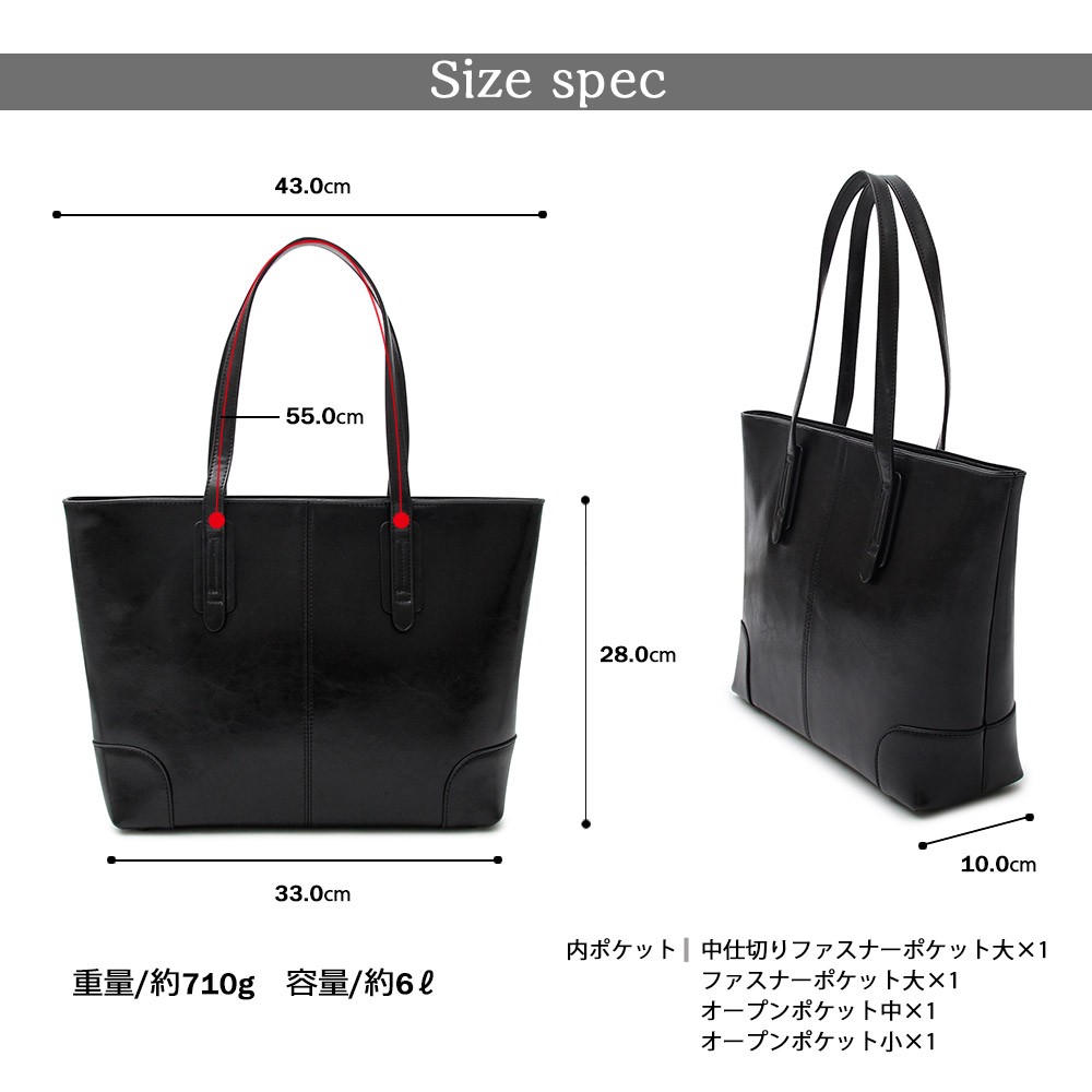 | サイズ(約:cm) | 縦28.0cm×横33.0cm×マチ10.0cm 【スペック】 持ち手の高さ / 20.0cm 閉じ口 / ファスナー 重量 / 720g 容量 / 6リットル |