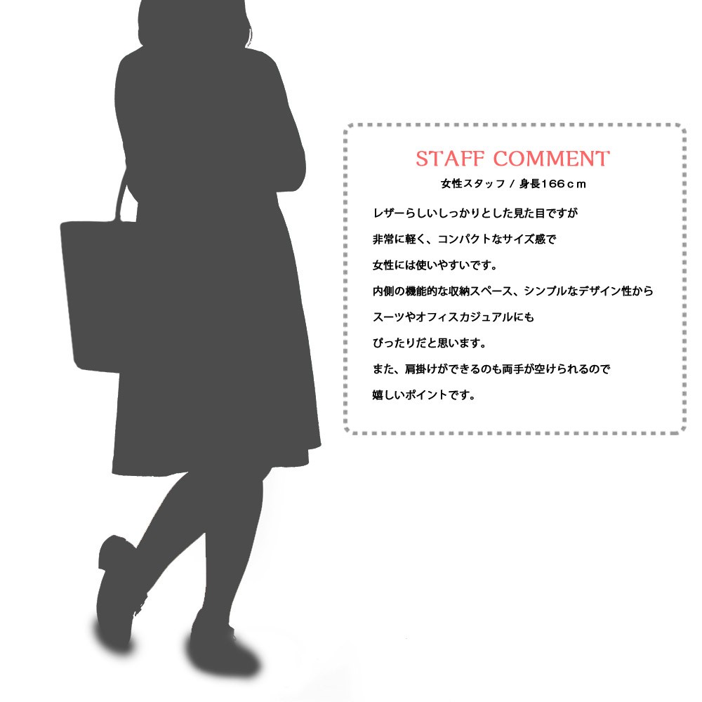 | 商品説明 | ”スプリットレザーを使ったシンプルなデザインのトートバッグ” 厚みのあるしっかりとしたスプリットレザー(牛床革)を使用。 レザーならではの質感と、高級感のある表情が魅力。 シンプルなデザインで、多くのコーデに使える合わせやすさが魅力。 高級感のある表情なので、カジュアルとしてだけでなくビジネスシーンにもお勧めの逸品。 A4ファイルがらくらく収納できるサイズで、多くのシーンで活躍。 ファスナーポケットになった間仕切りを配置し、機能的な収納に。 内側にはジップポケット、オープンポケットがあり、小物の収納にも便利な仕様。 程良い厚みを持った、持ちやすいハンドル部分は長めにデザインされており、肩掛けもしやすい仕様に。 |