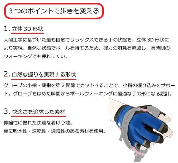 立体3D形状・自然な握りを実現する形状・快適さを追求した素材の3つのポイントで歩きを変える!道具を握ることを目的に開発されたエルゴグリップを採用したスポーツ手袋です。暗い道でも安心な反射材が付いています。 |