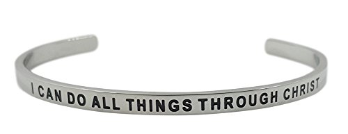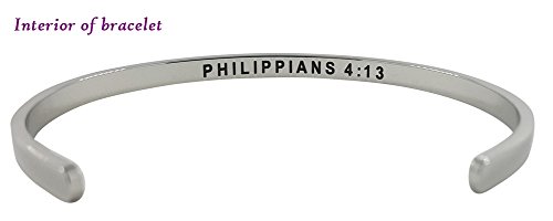 Inspirational bracelet is engraved with "I CAN DO ALL THINGS THROUGH CHRIST" on the outside and "Philippians 4:13" on the inside