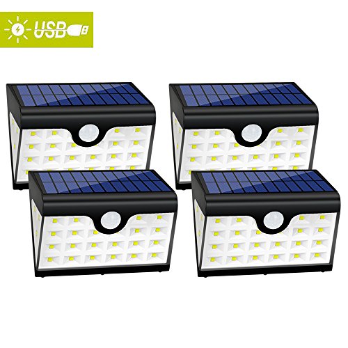 Hallomall USB Solar Lights, 28LED 300Lumens Max Wide-Angel Outdoor Wall Lights with 3LEDs Both Sides, Ultra Bright Motion Sensor Lights for Patios Stairways Lawn Garden, 3 Modes, Pack of 4