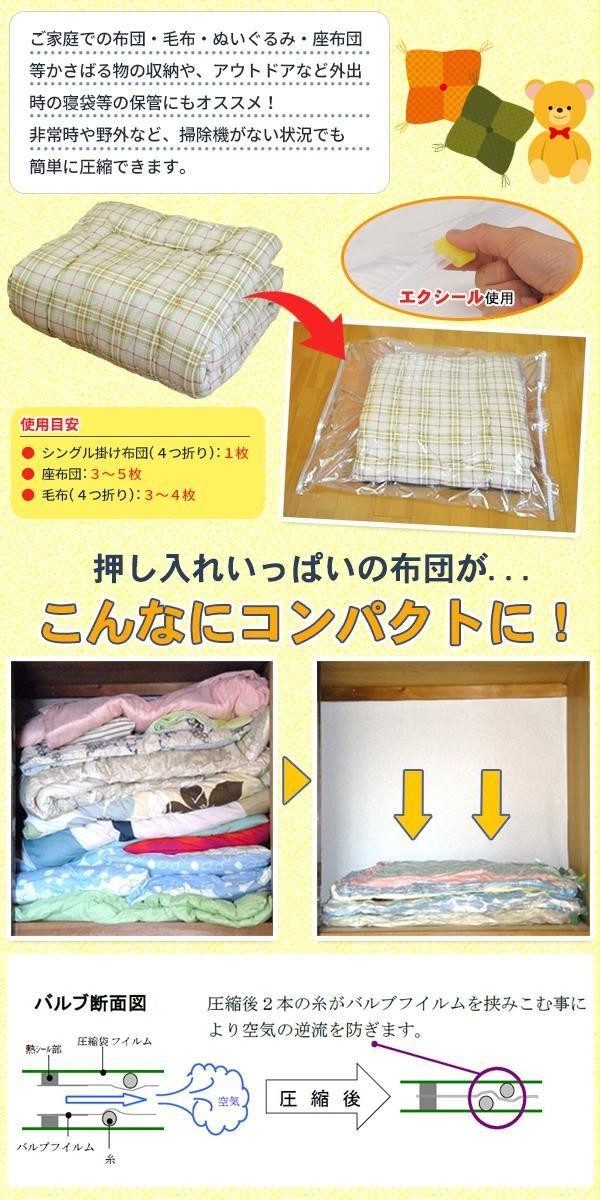 | 仕様 | シングル掛布団4つ折りで1枚、座布団3~5枚、毛布4つ折りで3~4枚(圧縮袋1枚あたり) |