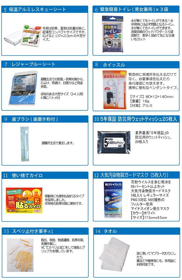 It is an evacuation set which adopted the backpack of 10 years preserved water, preserved food for 7 years, fire-proof association certified goods backpack.