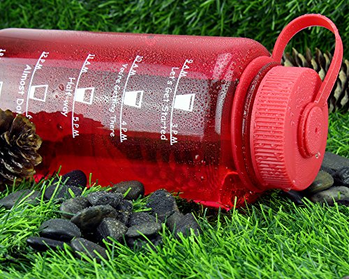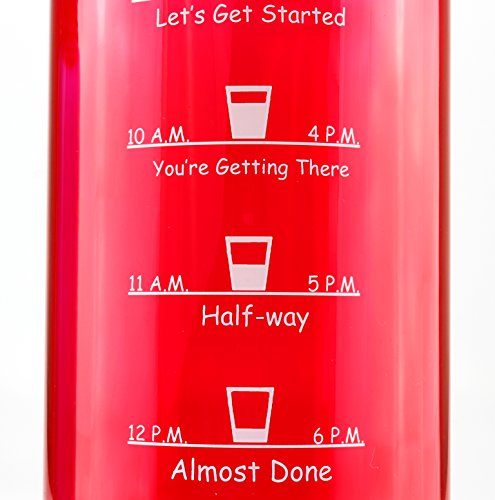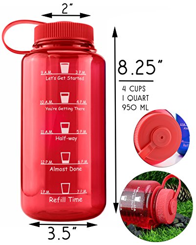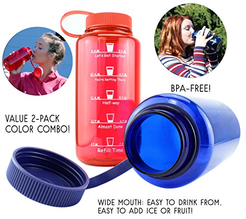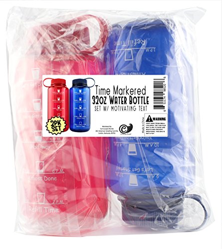 Studio : Cornucopia Brands Publisher : Cornucopia Brands Binding : Misc. Product Description 32-Ounce Timed Water Bottle (Blue Red Combo 2-Pack) Make good hydration a goal with our 2-pack of timed water bottles. With two 32-ounce water bottles, this is enough to get you through the day . . . or you can opt for a refill. You get one blue and one red bottle in this economy combo. Get inspired to get drinking . . . water! Markings give you goals for both AM PM. Great for on the go. Use these bottles at home, at work, at school, or for sports leisure. Take your bottles hiking, bicycling, climbing, and running. Features: Bottles have goal markings for morning afternoon in clear white print that shows up well against the colored background. Screw-on, screw-off top. Lids have a plastic collar strap, so no lost lids, also provides a loop for fastening. Wide mouth makes these bottles . . . . . .easy to clean . . .easy to drink from . . .easy to add ice or fruit to Wide base means this won't tip over like narrower bottles. Capacity: 32 ounces = 4 cups = 1 quart = 950 milliliters; Size: 8.25 inches tall by 3.5 inches diameter. Mouth opening 2 inches wide. Notes: This bottle is dishwasher safe, but it may be easier to wash the integrated lid if washing by hand, and would recommend top rack so as not to damage the labeling. This bottle is too wide for a standard cup holder. If you are in the car a lot, we recommend a cup holder expander--the same one you used to use for your biggie coke! Tritan plastic is a newer variety of plastic that is trademarked. It has been tested to be bpa-free and safe. It is a popular variety of plastic because it "looks like glass." It is also known for not giving an aftertaste to the water yet having the convenience of sturdy plastic. 0 |