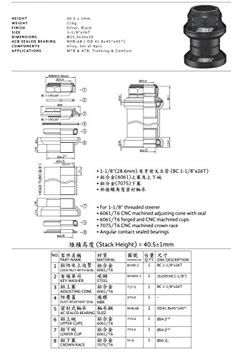 Studio : NECO Publisher : NECO Product Description Use for 1-1/8" (28.6mm) Threaded Steerer (BC 1-1/8" * 26T) Headtube ID.: 34mm Crown Race: 30mm Stack Height: 40.5mm Weight : 165g Material: 6061/T6 CNC machined adjusting cone with seals 6061/T6 forged and CNC machined cups 7075/T6 CNC machined crown race Angular contact sealed bearings SHIS NORM: EC34/28.6 | EC34/30
