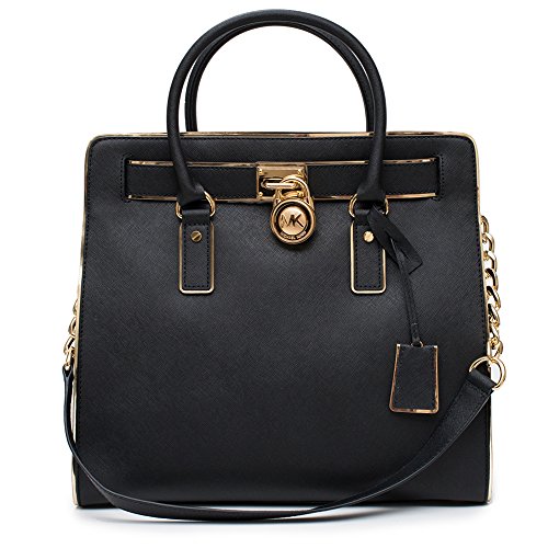 -. Feature : Black with Gold piping / Saffiano Leather -Two Top Handles, Leather Shoulder Strap -Interior Zip Pocket, Interior Cell Phone Pocket, Two Interior Pouch Pockets, Keyfob -Working Lock and Key / Approximate measurements: 14" x 13" x 6.25" -Magnetic Fastening -Fully Lined -Imported