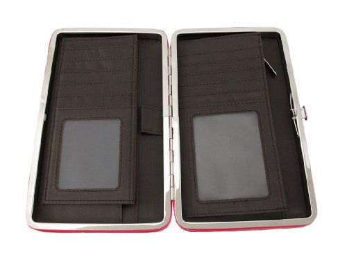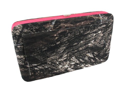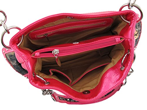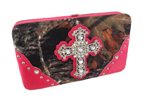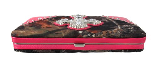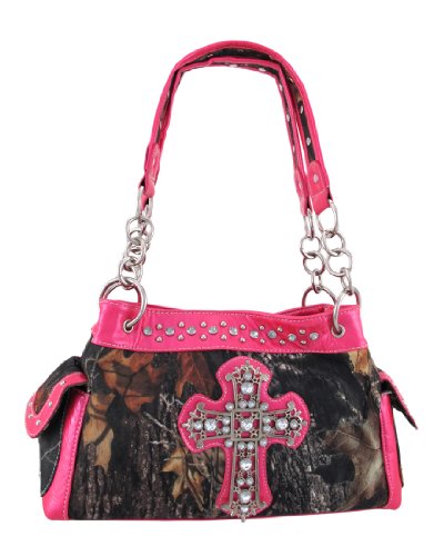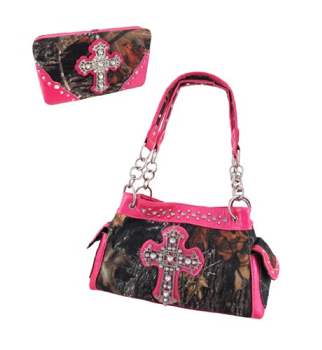 Product Description This handbag and hard wallet set makes a great gift for your favorite camouflage print lover. The beautiful Deep Forest camouflage print nylon handbag features a Gothic Cross on the front, embellished with over a dozen large clear faceted rhinestones. The glossy, hot pink vinyl trim panels are accented with chrome plated round studs and more clear faceted rhinestones. The straps have chrome chain links on both sides, and chrome studs on the handles. The nylon lined interior features a divider with a zipper pouch, 2 small side pockets and a side zippered pouch to help store your belongings. It measures 13 inches wide, 8 inches tall, and 5 inches deep. The straps have an 8 inch drop. The matching wallet features a large metal cross on the front, accented with stunning gleaming clear rhinestones. The wallet features: 9 Credit Card Slots, 2 Window View I.D. Slots, an Exterior Change Pocket and a Snap Closure. It measures 7 3/8 in. X 4 1/2 in. closed, 7 3/8 in. X 8 3/4 in. open. 0