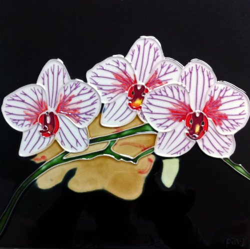 Continental Art Center BD-2082 8 by 8-Inch Three Lavender Striped White Orchid on a Stem with Black Background Ceramic Art Tile