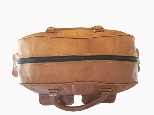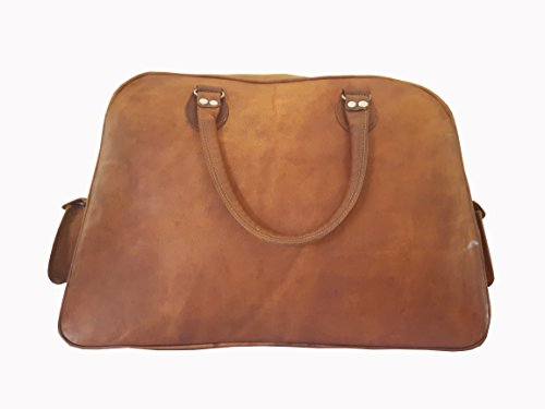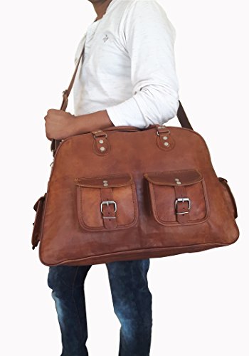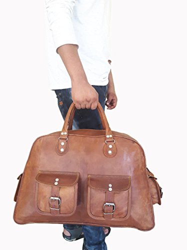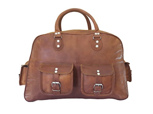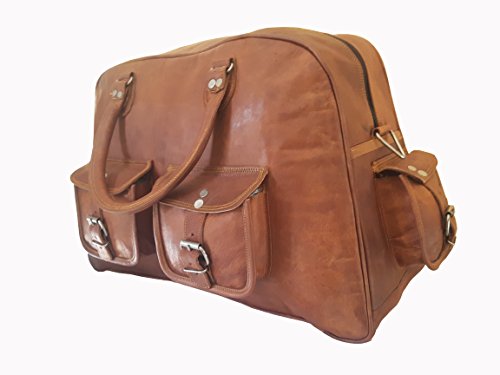 -. Feature : Dimensions : 11" inches ( Height ) x 9.5" inches ( Length ) x 4" inches ( Depth ) / Made from naturally processed and tanned leather, strong, lightweight, durable goat leather, tanned without the use of chemicals. / Big main compartments for clothing /travel and sports gear etc, multi utility bag can be used as a travel bag, gym duffel bag, sports duffel bag, overnight bag, weekend cabin duffel bag, carry on duffel etc, hand crafted product by experienced craftsman, high quality long lasting zippers, a genuine hand made product using natural leather. / Canvas lining and best quality accessories furnished / Bag have 2 pocket in front, 1 pocket on each side of the bag, one zippered pocket inside, two open compartments inside, detachable shoulder strap